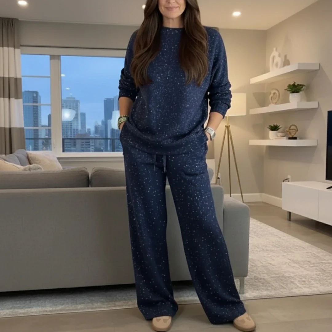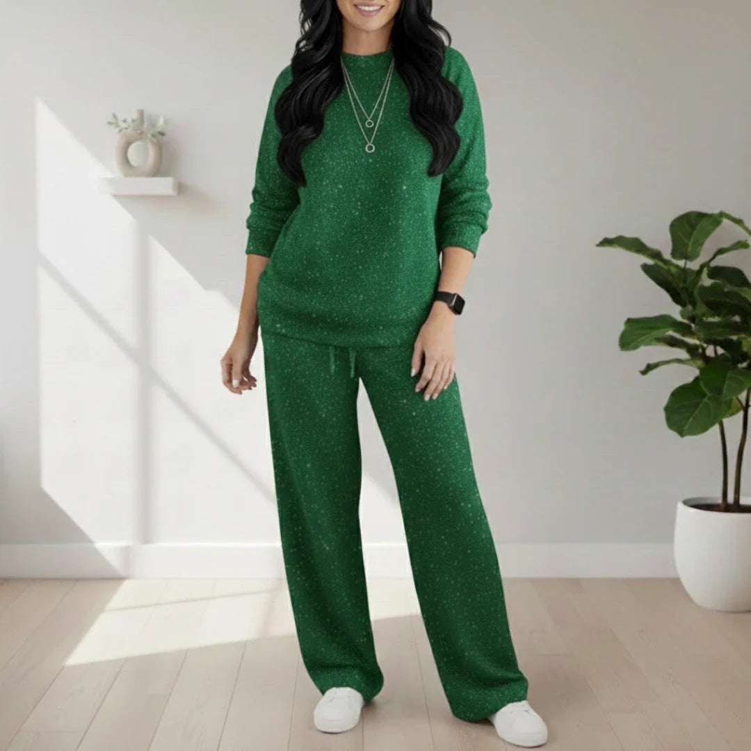 Comprising a sweater and matching pants, this set features a flowing cut that flatters the figure without being too tight. The subtle speckled pattern, enhanced with a light shimmer, adds a touch of refinement, perfect for a chic and relaxed look.