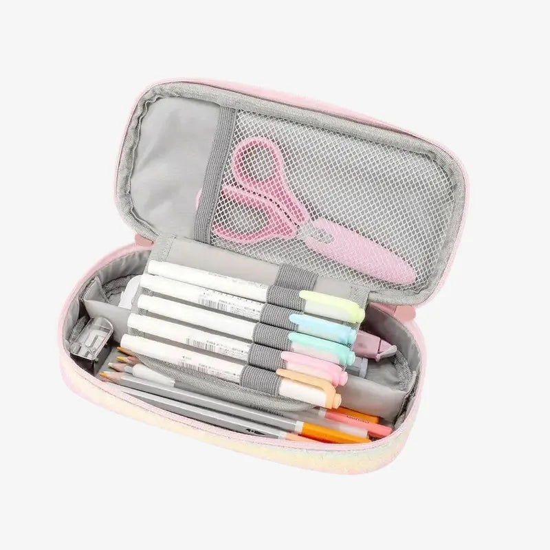Arc-en-Plumier est un plumier qui allie magie et douceur avec ses couleurs pastel en dégradé arc-en-ciel. Orné d’un léger effet pailleté, il attire immédiatement le regard tout en apportant une touche de fantaisie au quotidien scolaire. C’est l’accessoire parfait pour celles et ceux qui aiment rêver en grand.