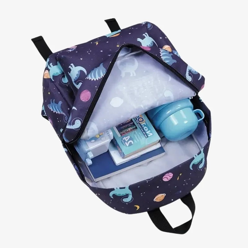 Le Dino Galaxy attire tous les regards grâce à son imprimé original et coloré. Les planètes, étoiles et constellations forment un décor féérique autour des adorables dinosaures, stimulant l’imagination des enfants tout en ajoutant une touche joyeuse à leur tenue scolaire.