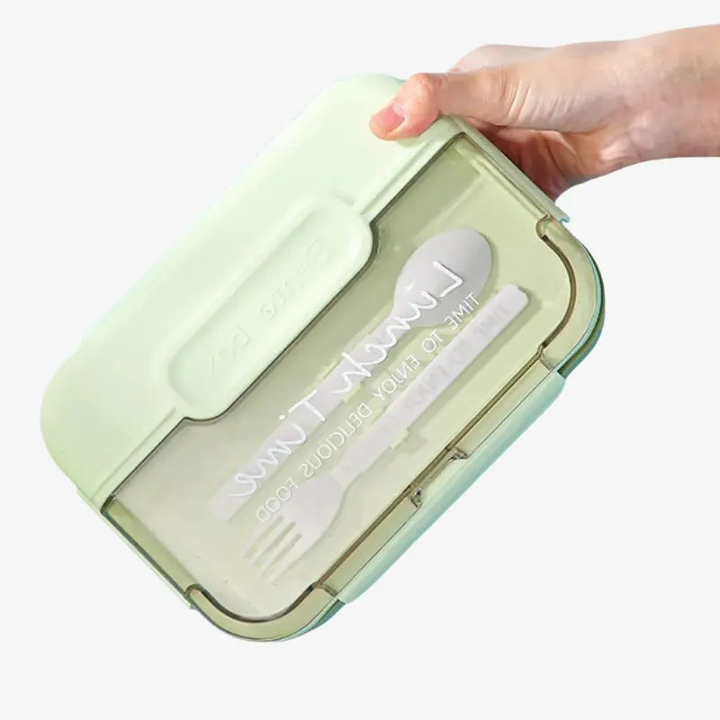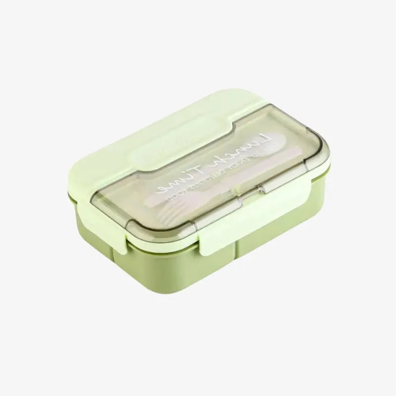 La Lunch Time Green comprend plusieurs compartiments intérieurs, permettant de séparer les aliments sans qu’ils ne se mélangent. Elle inclut également des couverts intégrés dans le couvercle, pour un repas pratique et sans accessoires supplémentaires à transporter. Son format est pensé pour accueillir un repas complet tout en restant léger.