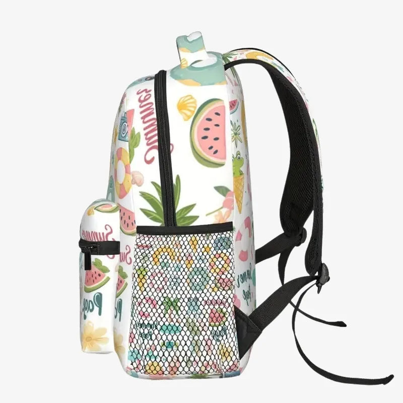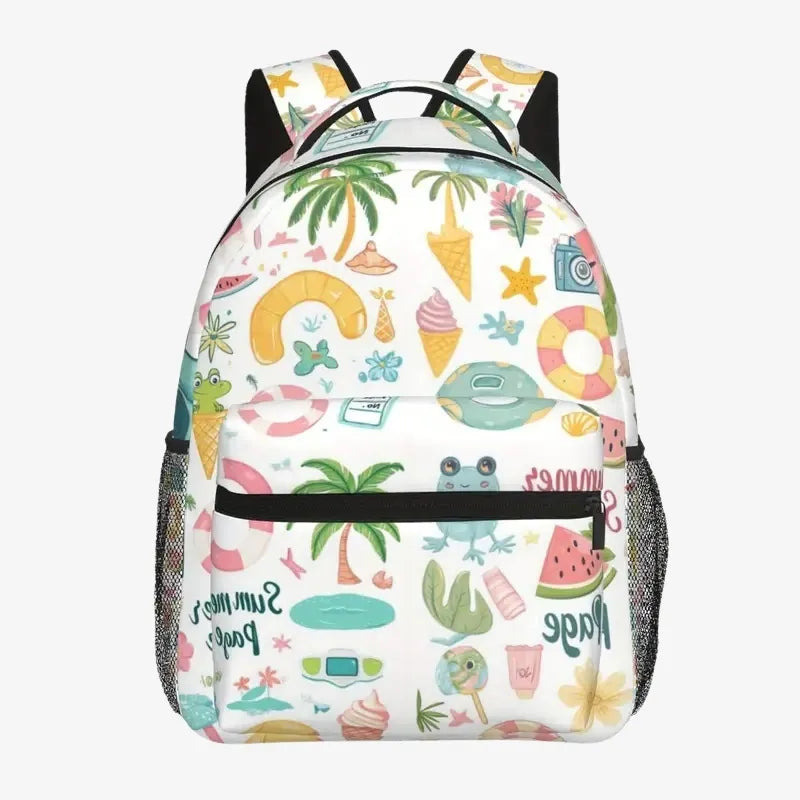 Palmiers, pastèques, appareils photo et coquillages décorent ce sac avec un charme irrésistible. Chaque motif a été soigneusement choisi pour captiver l’imagination des enfants et leur offrir un accessoire à la fois tendance et original.